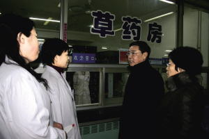 2009年12月29至30日,國家中醫藥管理局副局長馬建中前往河北省唐山市慰問基層干部職工,具體了解了當地中醫藥單位的發展情況,向辛勤工作在農村基層醫療衛生崗位的中醫藥人員表示慰問并送去新年的祝福。圖為馬建中(右二)在河北省唐山市中醫院。 陳勇 張正尤 攝