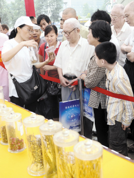 步行街中間,帶有傳統(tǒng)中國紅的立柱搭起了250多米的長廊,平日里就人流如潮的街上,此時更是摩肩接踵。再加上空中飄曳的氣球和標語,以及中醫(yī)藥人物方柱、紅花鑲嵌而成的“發(fā)展中醫(yī)、利國利民”橫幅,儼然一派節(jié)日的勝景。無論是白發(fā)蒼蒼的老人,還是蹣跚學步的小孩,都趕來體驗中醫(yī)藥的無窮魅力。
