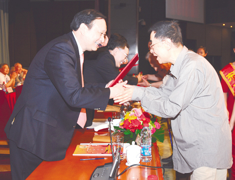 中華中醫藥學會舉行第五次全國會員代表大會 王國強當選為會長 王國強(左)為陸廣莘頒發中華中醫藥學會終身成就獎。 康 寧/攝