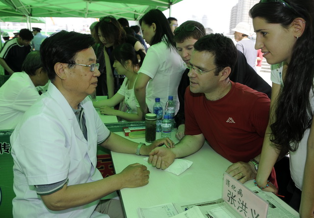 5月23日,在天津啟動儀式上,天津中醫藥大學的專家位外國友人把脈看病