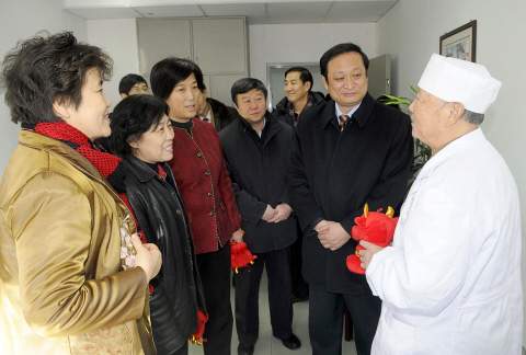 王國強(右二)、吳剛(右四)、趙靜(左二)等在北京中醫醫院看望節日期間堅守崗位的老專家。記者巨鋒 /攝 1月24日(農歷臘月二十九),衛生部副部長、國家中醫藥管理局局長王國強,副局長吳剛一行先后來到北京中醫醫院,中" />
