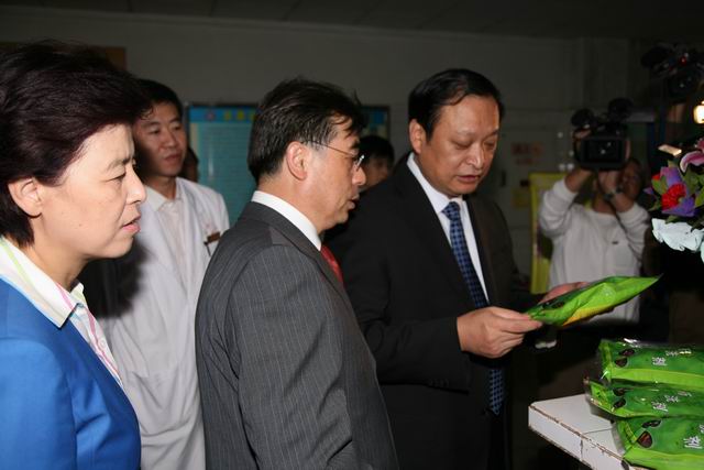 王國強副部長兼局長在咸輝副省長(左一)陪同下,視察省中醫院了解院內制劑情況(攝影 喬建安)