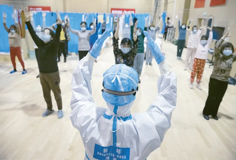 武漢江夏方艙醫院是武漢市首個以中醫院運轉模式來進行臨床治療、管理的方艙醫院。除了施用中藥湯劑,江夏方艙醫院的醫護人員還教患者習練太極拳、八段錦疏通經絡、調理氣血,并采取了溫灸、耳穴壓豆、經絡拍打等中醫綜合治療手段。圖為2020年2月25日,湖南中醫藥大學第一附屬醫院醫護人員在江夏方艙醫院帶領新冠肺炎患者習練八段錦。 新華社記者 沈伯韓/攝