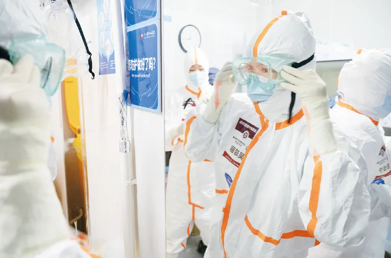2020年3月29日,第四批國家中醫醫療隊(上海)在武漢雷神山醫院結束了最后一班崗,3月31日全隊返回上海。該醫療隊由上海中醫藥大學附屬龍華醫院、上海中醫藥大學附屬市中醫醫院的122名醫護人員組成,負責雷神山醫院感染三科五病區。圖為3月29日,在武漢雷神山醫院,該醫療隊一名隊員準備進入隔離病房污染區。 新華社記者 才揚/攝