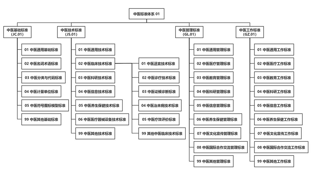 第三層:按照中醫藥各專業領域下的業務類型進行劃分,用2位阿拉伯數字表示。其中01表示通用類標準……99代表其他。