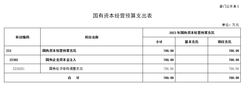 2023年國有資本經營預算數為700萬元,主要是國有經濟結構調整支出項目。