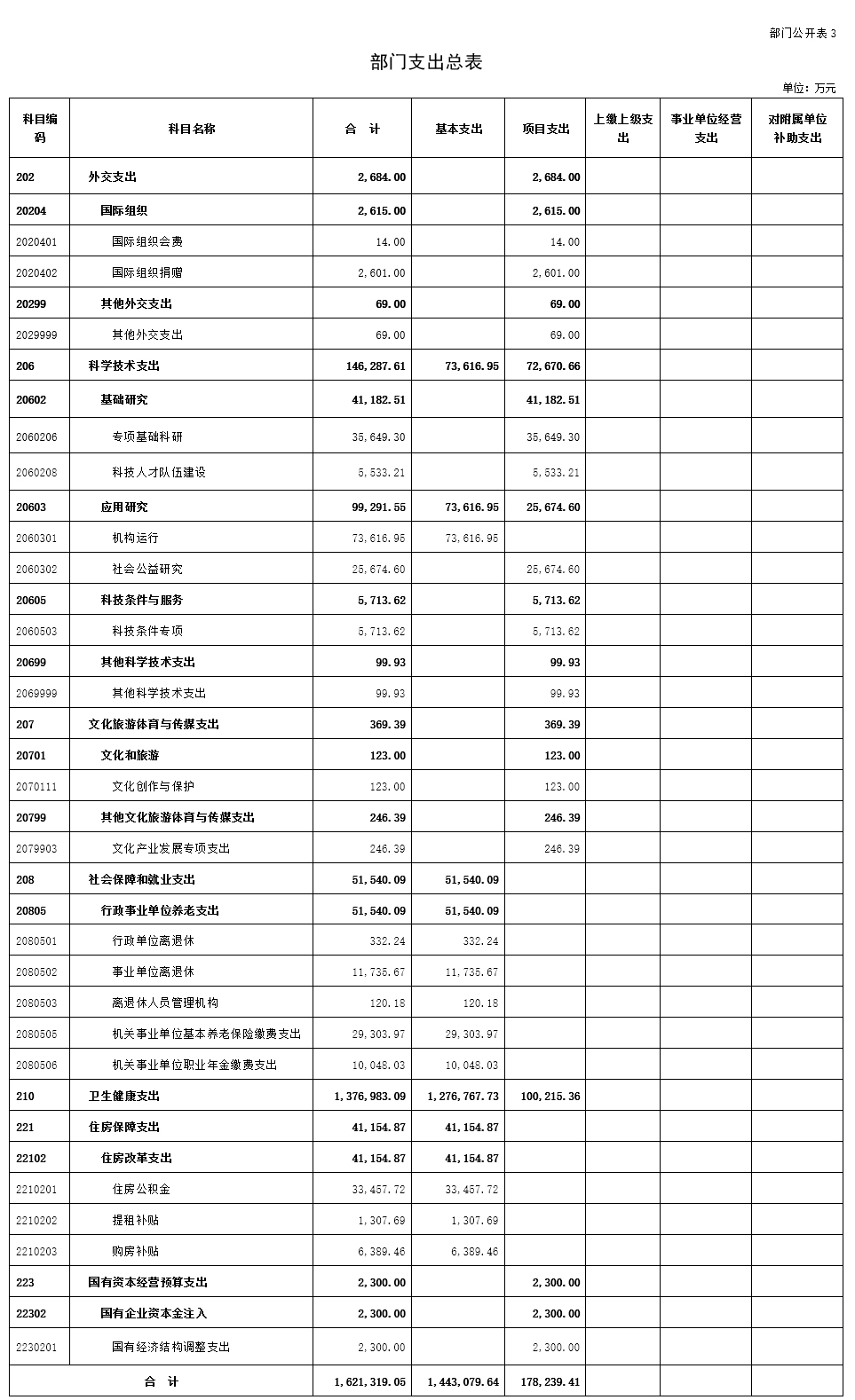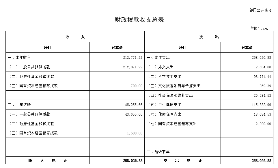 2023年財政撥款收支總預算258026.88萬元。收入為一般公共預算撥款、國有資本經營預算撥款,無政府性基金預算撥款,包括:一般公共預算當年撥款收入212071.22 萬元、國有資本經營預算當年撥款收入700萬元,上年結轉43655.66 萬元;支出包括:外交支出2684萬元、科學技術支出98771.44萬元、文化旅游體育與傳媒支出369.39萬元、社會保障和就業支出20484.53萬元、衛生健康支出115332.99萬元、住房保障支出18084.53萬元、國有資本經營預算支出2300萬元。