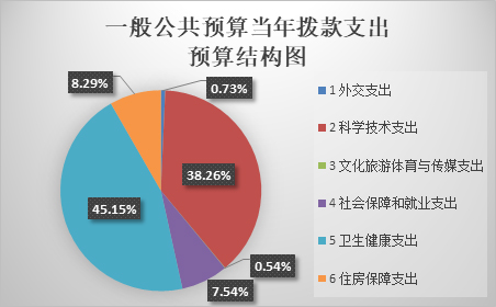 外交支出1478萬元,占0.70%;科學技術支出81143.94萬元,占38.26%;文化旅游體育與傳媒支出123萬元,占0.06%;社會保障和就業支出15994.05萬元,占7.54%;衛生健康支出95746.23萬元,占45.15%;住房保障支出17586萬元,占8.29%。