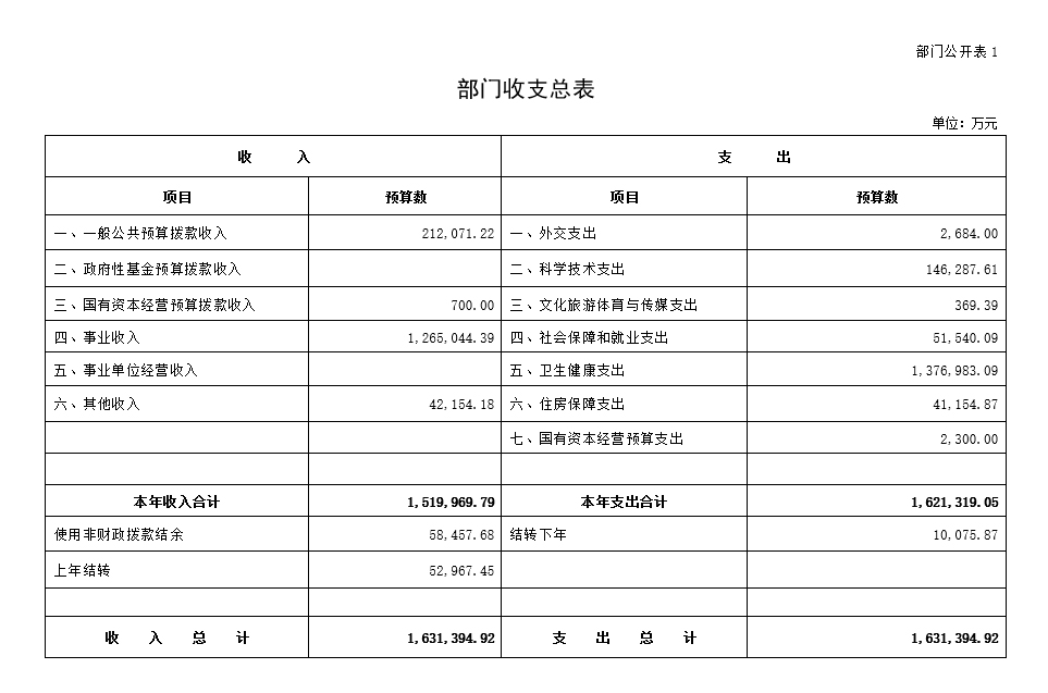 2023年收支總預算1631394.92 萬元。收入包括:一般公共預算撥款收入212071.22萬元、國有資本經營預算撥款收入700萬元、事業收入1265044.39萬元、其他收入42,154.18萬元、使用非財政撥款結余58457.68萬元、上年結轉52967.45萬元;支出包括:外交支出2684萬元、科學技術支出146287.61萬元、文化旅游體育與傳媒支出369.39萬元、社會保障和就業支出51540.09萬元、衛生健康支出1376983.09萬元、住房保障支出41154.87萬元、國有資本經營預算支出2300.00萬元、結轉下年10075.87萬元。