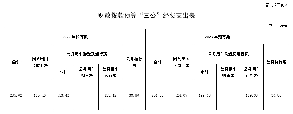 2023年“三公”經費預算數為284.5萬元,比2022年減少0.39%。其中:因公出國(境)費用124.07萬元;公務用車購置及運行費129.63萬元,包括公務用車購置費0萬元、公務用車運行費129.63萬元;公務接待費30.8萬元。