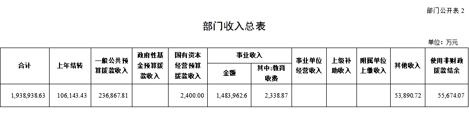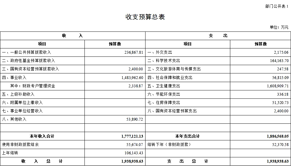 2025年收支總預(yù)算1,938,938.63萬(wàn)元。收入包括:一般公共預(yù)算撥款收入236,867.81萬(wàn)元、國(guó)有資本經(jīng)營(yíng)預(yù)算撥款收入2,400萬(wàn)元、事業(yè)收入1,483,962.6萬(wàn)元、其他收入53,890.72萬(wàn)元、使用非財(cái)政撥款結(jié)余55,674.07萬(wàn)元、上年結(jié)轉(zhuǎn)106,143.43萬(wàn)元;支出包括:外交支出2,175.06萬(wàn)元、科學(xué)技術(shù)支出164,163.7萬(wàn)元、文化旅游體育與傳媒支出247.58萬(wàn)元、社會(huì)保障和就業(yè)支出56,815.09萬(wàn)元、衛(wèi)生健康支出1,608,909.71萬(wàn)元、節(jié)能環(huán)保支出336.18萬(wàn)元,住房保障支出51,520.73萬(wàn)元、國(guó)有資本經(jīng)營(yíng)預(yù)算支出2,400萬(wàn)元、結(jié)轉(zhuǎn)下年52,370.58萬(wàn)元。