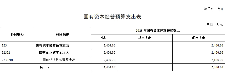 2025年國(guó)有資本經(jīng)營(yíng)預(yù)算數(shù)為2,400萬(wàn)元,主要是國(guó)有經(jīng)濟(jì)結(jié)構(gòu)調(diào)整支出項(xiàng)目。