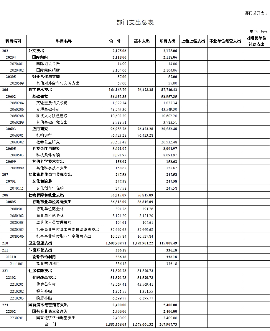 2025年財(cái)政撥款收支總預(yù)算291,789.16萬(wàn)元。收入為一般公共預(yù)算撥款、國(guó)有資本經(jīng)營(yíng)預(yù)算撥款,包括:一般公共預(yù)算當(dāng)年撥款收入236,867.81萬(wàn)元、國(guó)有資本經(jīng)營(yíng)預(yù)算當(dāng)年撥款收入2,400萬(wàn)元,上年結(jié)轉(zhuǎn)52,521.35萬(wàn)元。支出包括:外交支出2,175.06萬(wàn)元,占0.75%;科學(xué)技術(shù)支出114,461.15萬(wàn)元,占39.23%;文化旅游體育與傳媒支出247.58萬(wàn)元,占0.08%;社會(huì)保障和就業(yè)支出23,667.43萬(wàn)元,占8.11%;衛(wèi)生健康支出130,197.66萬(wàn)元,占44.62%;節(jié)能環(huán)保支出336.18萬(wàn)元,占0.12%;住房保障支出18,304.1萬(wàn)元,占6.27%;國(guó)有資本經(jīng)營(yíng)預(yù)算支出2,400萬(wàn)元,占0.82%。