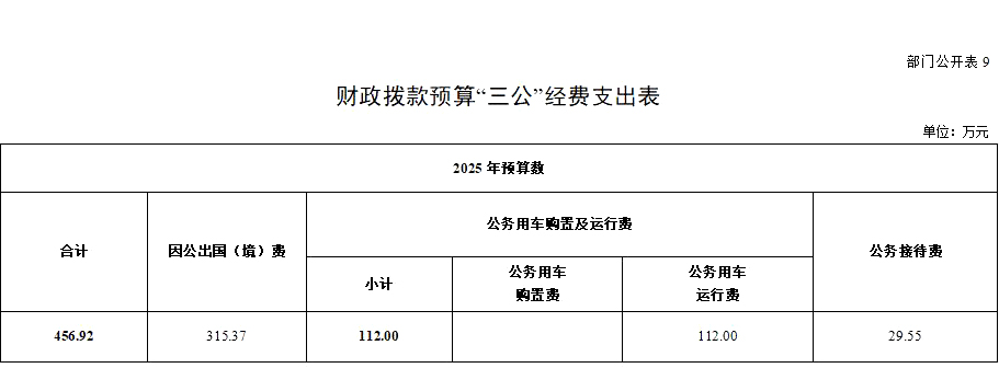 2025年“三公”經(jīng)費(fèi)預(yù)算數(shù)為456.92萬(wàn)元,其中:因公出國(guó)(境)費(fèi)315.37萬(wàn)元;公務(wù)用車(chē)購(gòu)置及運(yùn)行費(fèi)112萬(wàn)元,包括公務(wù)用車(chē)運(yùn)行費(fèi)112萬(wàn)元;公務(wù)接待費(fèi)29.55萬(wàn)元。