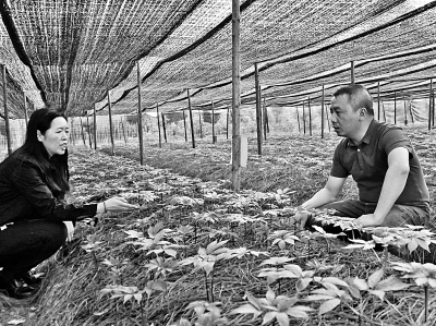 科研人員在文山苗鄉三七種植基地查看三七種苗。本報記者張勇攝/光明圖片