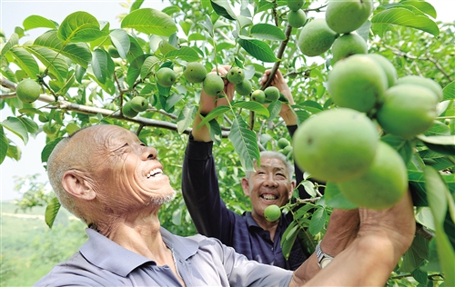 左權縣充分挖掘“核桃產業大縣”的品牌優勢,積極發展核桃經濟林項目。圖為村民在查看核桃長勢。 邢蘭富攝