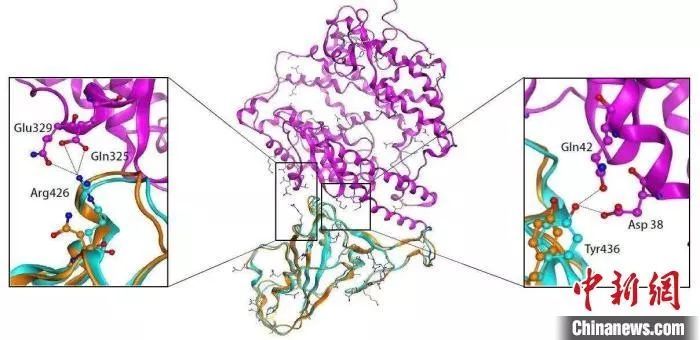 計(jì)算機(jī)模型:病毒S蛋白與人ACEⅡ蛋白結(jié)合示意圖中科院上海巴斯德所/供圖