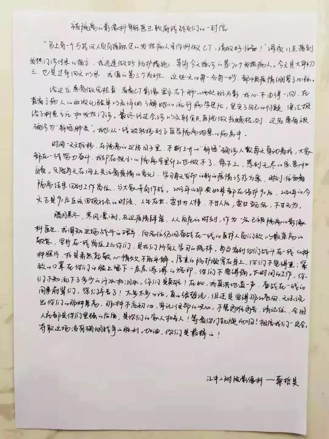 陳智華在隔離病房開啟了遠程辦公。臨床一線的醫生有什么問題,他都在微信或是電話這頭耐心解答,與前線的同事們一起抗擊疫情。許員琴隔離期間不忘囑咐科里的護士安排好工作,注意自身防護。其他醫務人員也從不放松新冠肺炎相關知識的學習,時刻為出來后奮戰一線做好充足準備!他們還給前線的醫生寫信加油鼓勁,解除隔離后,還要與大家并肩作戰,共同抗疫!