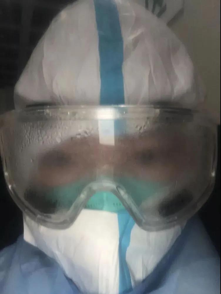 這張照片是我剛帶上護目鏡1個小時的樣子,護目鏡里面全是霧水,在這樣的情況下,我還得工作5、6個小時,不吃、不喝、不拉,只為了防護服外我們守護的那些戰(zhàn)友們,她們用堅強樂觀的精神感動著我們,我們理應回報同樣的努力!