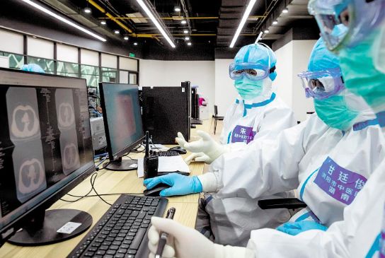 2月25日,湖南省援鄂抗疫國(guó)家中醫(yī)醫(yī)療隊(duì)醫(yī)護(hù)人員,在武漢市江夏區(qū)方艙醫(yī)院為新冠肺炎患者會(huì)診中醫(yī)治療方案。(湖北日?qǐng)?bào)全媒記者 張鴻 通訊員 涂麗 攝)