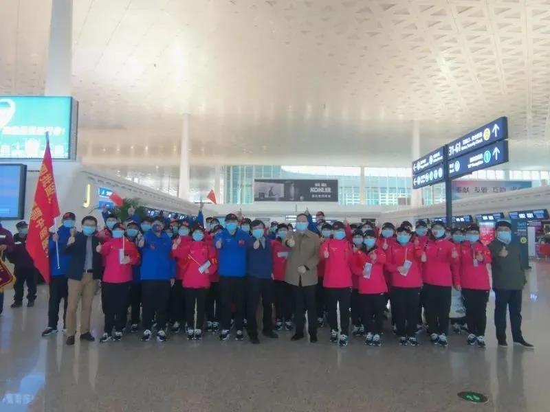 武漢天河機(jī)場(chǎng),進(jìn)站大廳的屏幕上不停滾動(dòng)致敬白衣天使的標(biāo)語。醫(yī)療隊(duì)身著統(tǒng)一的服裝,手舉國(guó)旗,臉上貼著“我愛中國(guó)”的貼紙。