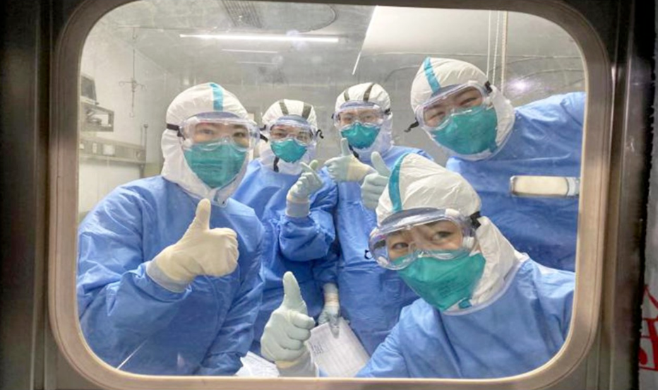 國家中醫醫療隊隊員為戰“疫”加油。