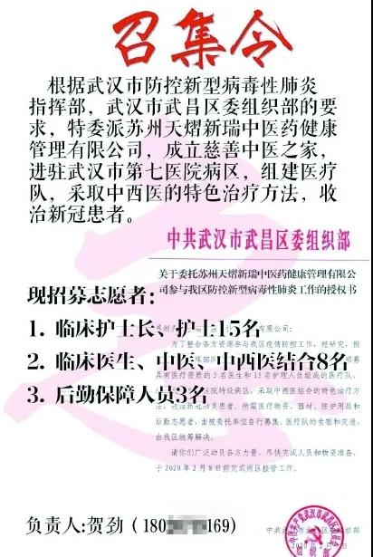 這群中醫的故事要從一道征集令說起。2月初,武漢招募個體中醫志愿者的公告在業內流傳:“中共武漢市武昌區委組織部授權蘇州天熠新瑞中醫藥健康管理有限公司,成立慈善中醫之家,招募具有資質的5名醫生和15名護理人員組成醫療隊,進駐武漢市第七醫院特設病區,采取中西醫結合的治療方法,收治新冠肺炎患者。”