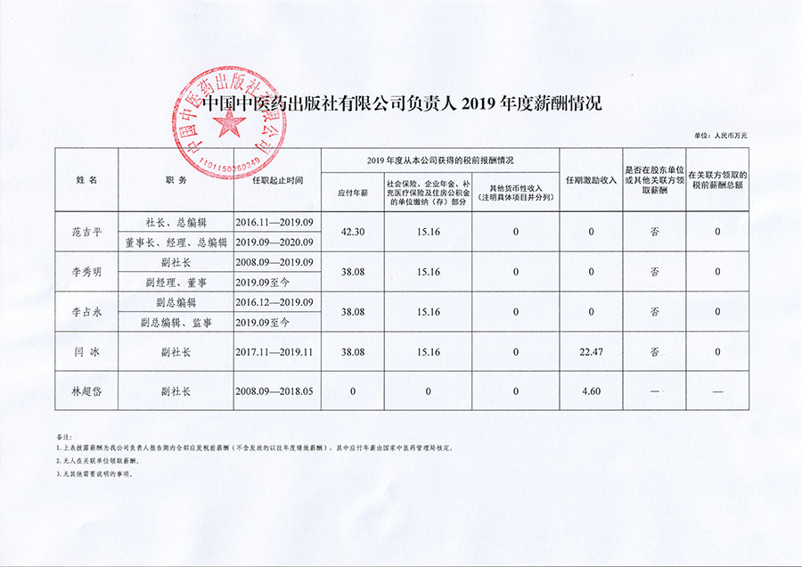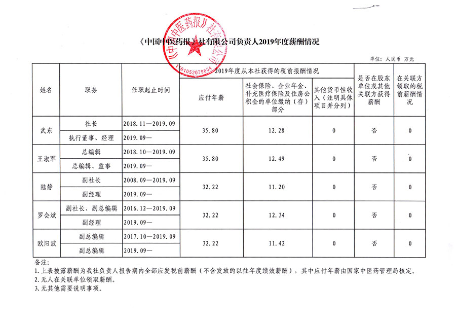 2019年度國家中醫藥管理局直屬企業負責人薪酬情況