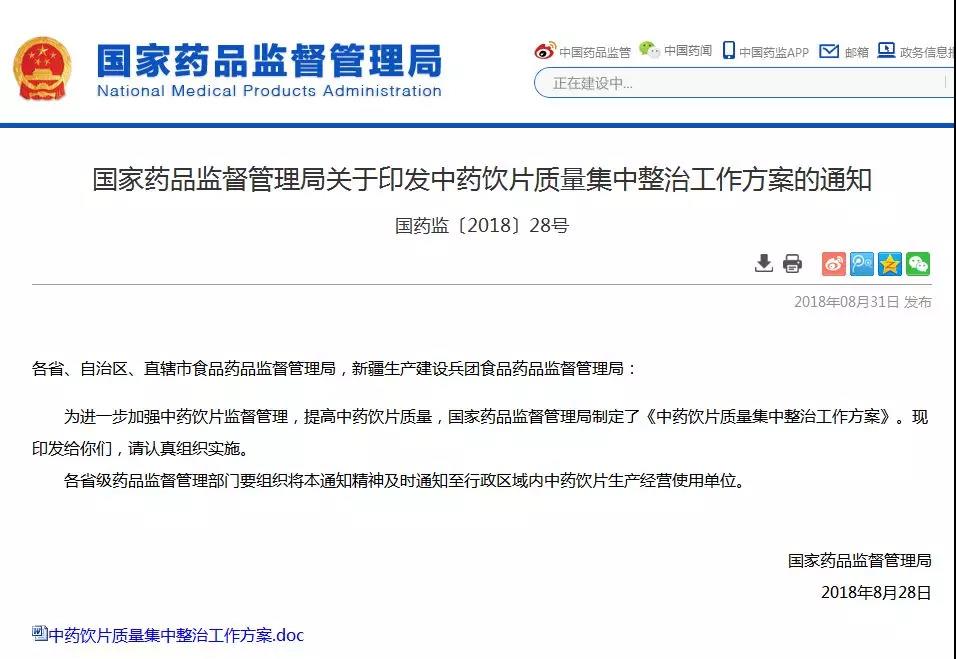 為進一步加強中藥飲片監督管理,提高中藥飲片質量,根據今年8月國家藥監局發布的《關于印發中藥飲片質量集中整治工作方案的通知》要求,從今年10月開始對全國各省(區、市)中藥飲片進行為期一年的質量集中整頓,要求各省市完成嚴厲查處中藥飲片違法違規行為和加快完善符合中藥飲片特點的技術管理體系這兩項重點工作?!锻ㄖ分赋?,將嚴查中藥飲片的生產、流通以及經營中的違法行為。同時,要嚴厲查處不合格中藥飲片,針對重點區域和重點品種加大抽檢頻次。