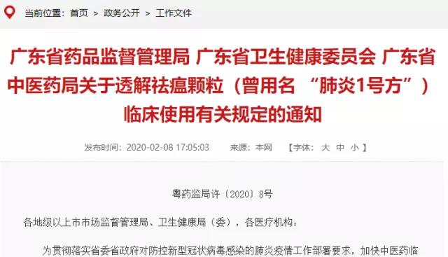 2月8日,廣東省藥品監(jiān)督管理局官網(wǎng)發(fā)布最新消息,同意廣州市第八人民醫(yī)院申報(bào)的透解祛瘟顆粒(曾用名“肺炎1號方”)用于全省30家新型冠狀病毒感染的肺炎定點(diǎn)救治醫(yī)院臨床使用。非定點(diǎn)醫(yī)院申請調(diào)劑使用,將由省藥監(jiān)局予以優(yōu)先審批。