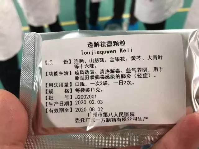 2月3日,省中醫(yī)藥局、省藥品監(jiān)督管理局組織對廣州市第八人民醫(yī)院“肺炎1號方”顆粒醫(yī)療機(jī)構(gòu)制劑應(yīng)急審批及臨床應(yīng)用進(jìn)行聯(lián)合專家論證會。經(jīng)論證,基于“肺炎1號方”顆粒具有改善新型冠狀病毒感染的肺炎(輕癥)臨床癥狀和可能減少重型肺炎發(fā)生趨勢的療效,同意“肺炎1號方”顆粒按照廣東省醫(yī)療機(jī)構(gòu)傳統(tǒng)中藥制劑提出備案申請,并納入應(yīng)急審批程序準(zhǔn)予附條件備案。該制劑規(guī)范名稱為"透解祛瘟顆粒"。