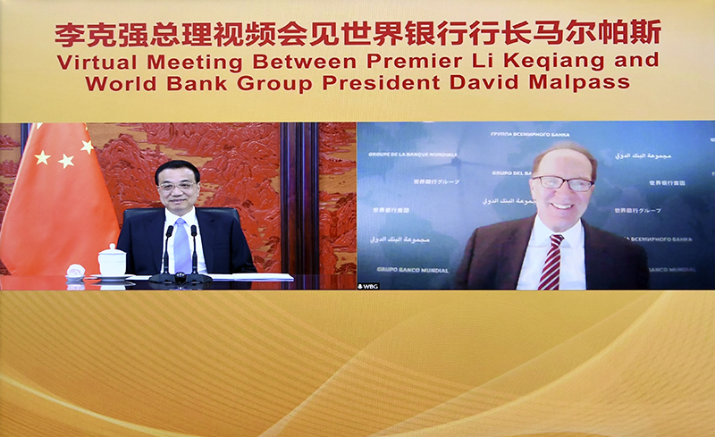 12月13日,國務(wù)院總理李克強在北京中南海紫光閣視頻會見世界銀行行長馬爾帕斯。新華社記者 殷博古 攝