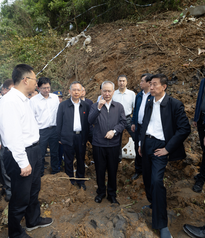 受黨中央、國務院委派,中共中央政治局委員、國務院副總理劉鶴和國務委員王勇率有關部門負責同志3月22日凌晨抵達廣西梧州,指導“3·21”東航MU5735航空器飛行事故現場救援、善后處置及事故原因調查工作。22日上午,劉鶴、王勇來到事故現場,實地查看環境條件,仔細了解救援工作進展,并看望慰問搜救人員。新華社記者 劉彬 攝