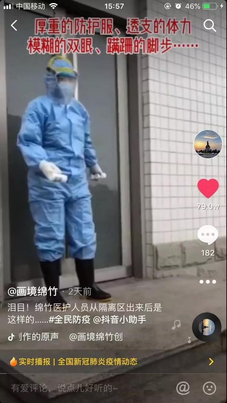 視頻里綿竹市中醫(yī)醫(yī)院集中醫(yī)學(xué)觀察點(diǎn)護(hù)理人員唐珊外出開展污水處理工作,由于長(zhǎng)時(shí)間穿戴防護(hù)服,行動(dòng)很是不便,護(hù)目鏡上的霧氣讓她雙眼模糊,回來(lái)時(shí)走路時(shí)都差點(diǎn)摔倒。為了避免交叉感染,她還婉拒了身邊人幫忙的好意,一句“你不要接觸我”讓人心疼。