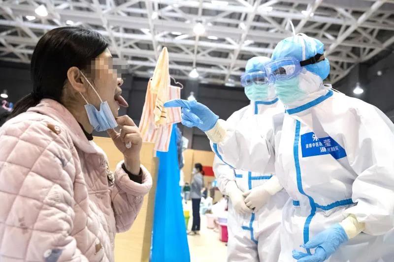 2月25日,湖南中醫藥大學第一附屬醫院副院長、江夏方艙醫院副院長朱瑩(右一)查看新冠肺炎患者的舌象。