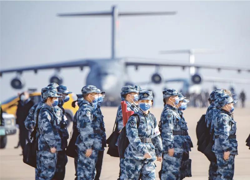 2020年2月17日,中國人民解放軍空軍再次出動運-20等三型多架運輸機,從上海虹橋等7個機場起飛,向武漢緊急空運軍隊支援湖北醫(yī)療隊676名隊員和50噸醫(yī)療物資。湖北日報全媒記者 魏錸/攝