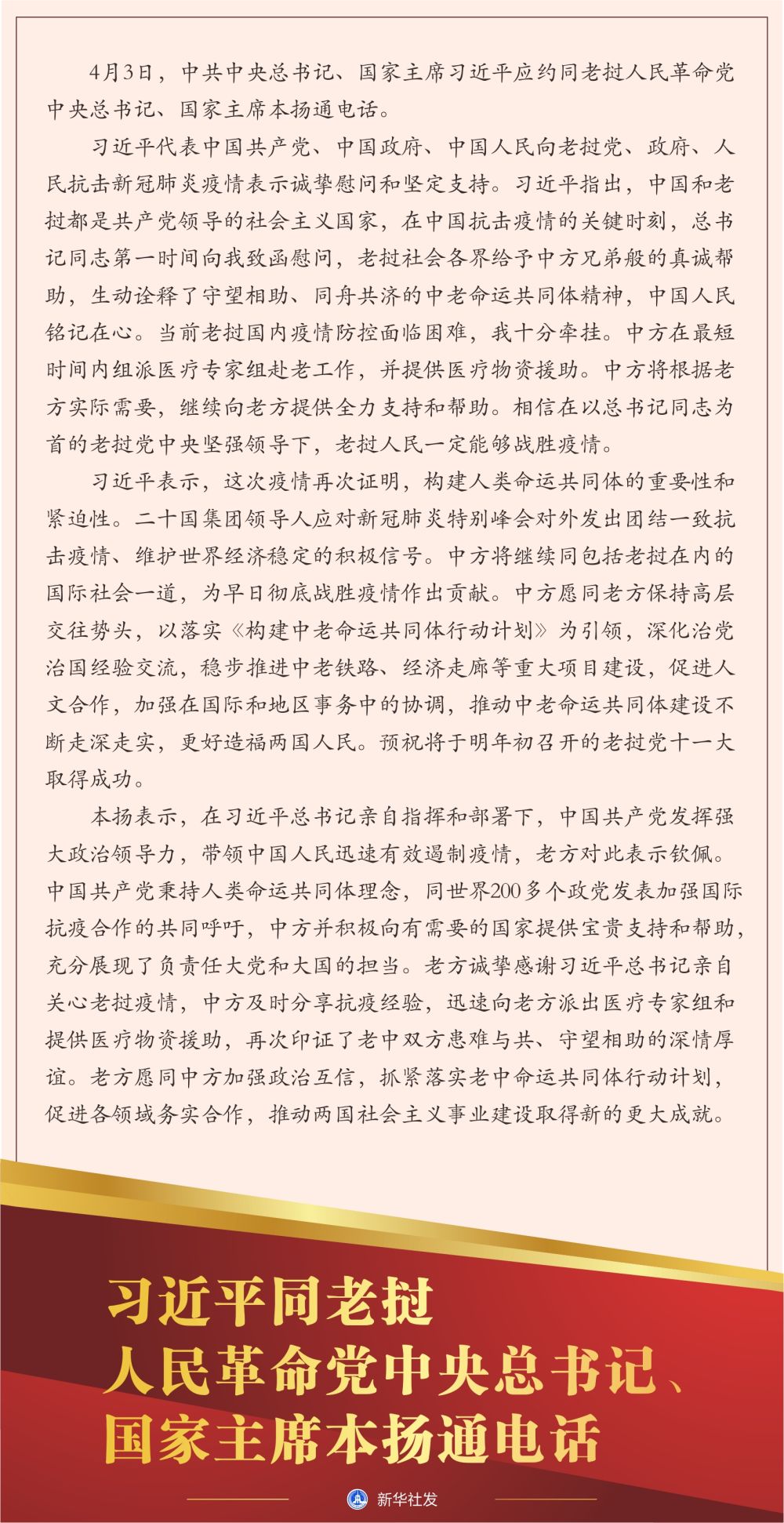 習近平代表中國共產黨、中國政府、中國人民向老撾黨、政府、人民抗擊新冠肺炎疫情表示誠摯慰問和堅定支持。習近平指出,中國和老撾都是共產黨領導的社會主義國家,在中國抗擊疫情的關鍵時刻,總書記同志第一時間向我致函慰問,老撾社會各界給予中方兄弟般的真誠幫助,生動詮釋了守望相助、同舟共濟的中老命運共同體精神,中國人民銘記在心。當前老撾國內疫情防控面臨困難,我十分牽掛。中方在最短時間內組派醫療專家組赴老工作,并提供醫療物資援助。中方將根據老方實際需要,繼續向老方提供全力支持和幫助。相信在以總書記同志為首的老撾黨中央堅強領導下,老撾人民一定能夠戰勝疫情。