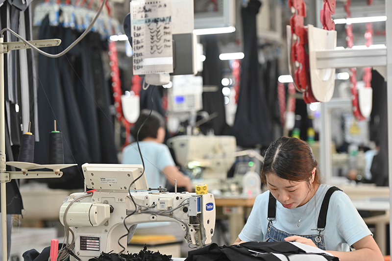 在位于福建省泉州市經濟技術開發區的九牧王西褲智能化生產車間,工人在自動化西褲吊掛流水線上作業(7月30日攝)。新華社記者 宋為偉 攝