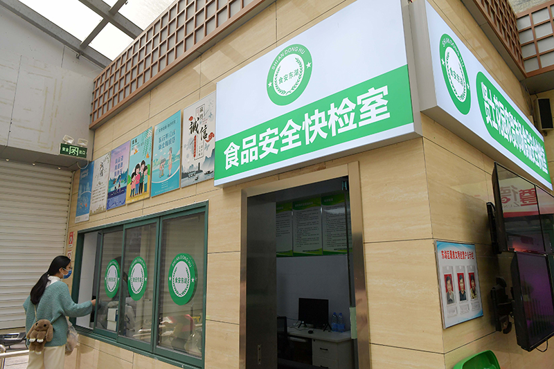 2021年12月7日,在江西省南昌市東湖區(qū)賢士花園農(nóng)貿(mào)市場,市民將剛購買的蔬菜送檢。2021年,東湖區(qū)在全區(qū)11個農(nóng)貿(mào)市場建成食品安全快速檢測室,對市民送檢樣品中的農(nóng)藥殘留、瘦肉精、甲醛等11種有害物質(zhì)進(jìn)行免費現(xiàn)場快速檢測,守護(hù)群眾“舌尖上的安全”。新華社記者 彭昭之 攝