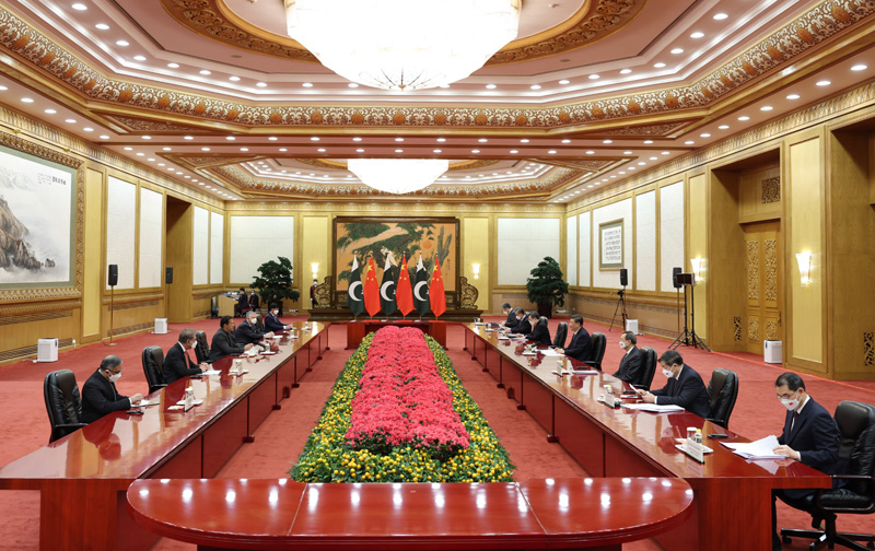 2月6日上午,國家主席習近平在北京人民大會堂會見來華出席北京2022年冬奧會開幕式的巴基斯坦總理伊姆蘭·汗。新華社記者 劉衛兵 攝