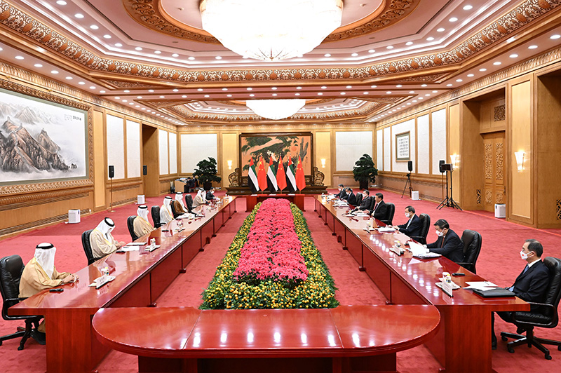 2月5日下午,國家主席習近平在北京人民大會堂會見來華出席北京2022年冬奧會開幕式的阿聯酋阿布扎比王儲穆罕默德。新華社記者 申宏 攝