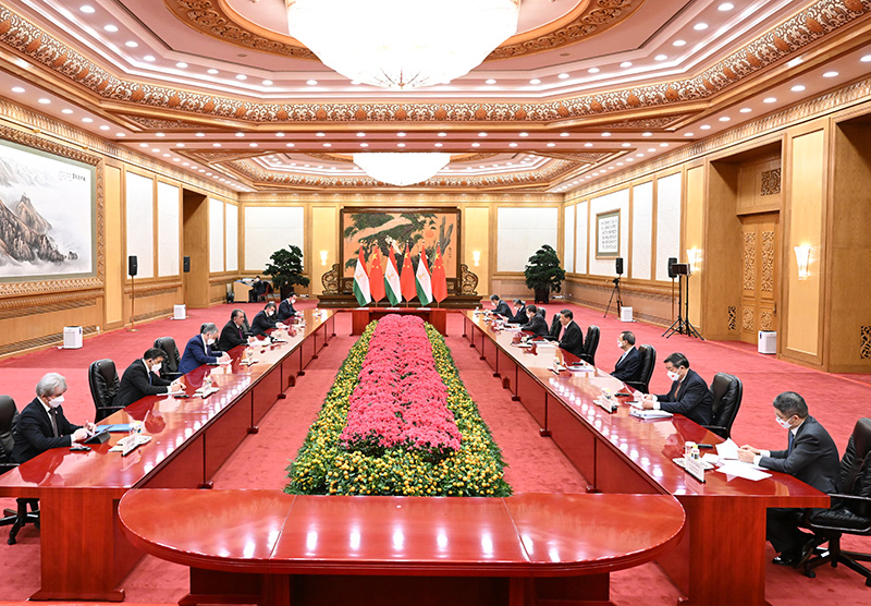 2月5日下午,國家主席習近平在北京人民大會堂會見來華出席北京2022年冬奧會開幕式的塔吉克斯坦總統拉赫蒙。新華社記者 李響 攝