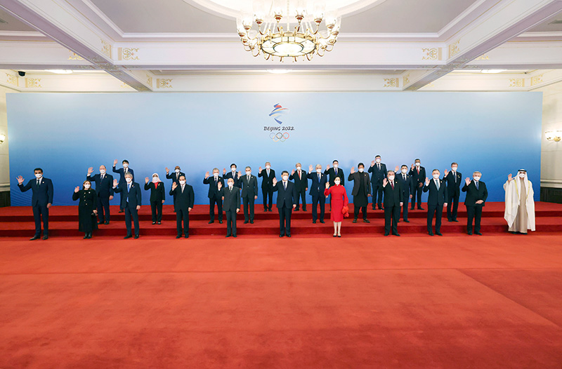 2月5日中午,國家主席習近平和夫人彭麗媛在北京人民大會堂金色大廳舉行宴會,歡迎出席北京2022年冬奧會開幕式的國際貴賓。這是習近平和彭麗媛同國際貴賓一起合影留念。新華社記者 劉衛兵 攝