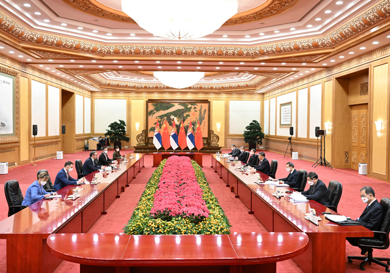 2月5日上午,國(guó)家主席習(xí)近平在北京人民大會(huì)堂會(huì)見來(lái)華出席北京2022年冬奧會(huì)開幕式的塞爾維亞總統(tǒng)武契奇。新華社記者 李響 攝