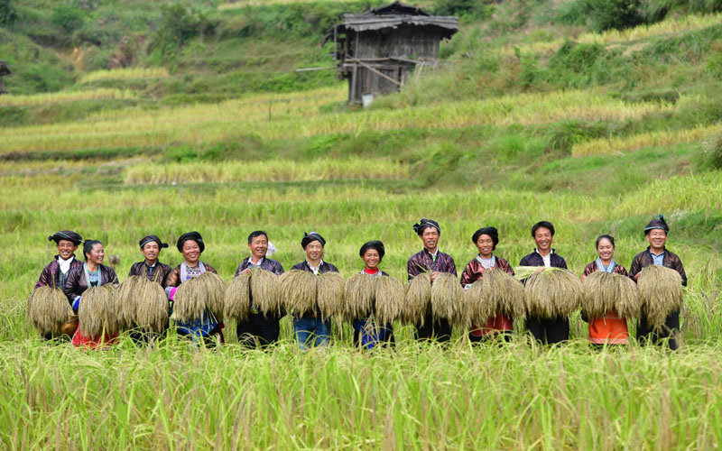 在廣西融水苗族自治縣良寨鄉大里村,村民們展示剛剛收割的脫貧特色產品——紫黑香糯(2018年10月12日攝)。新華社記者 黃孝邦 攝