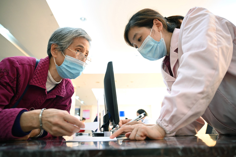 福建省三明市第一醫院的醫保辦工作人員(右)向前來咨詢藥品報銷問題的居民講解相關政策(2020年11月18日攝)。新華社記者 姜克紅 攝