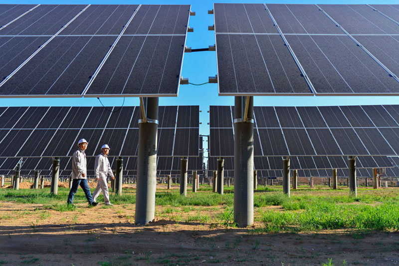工作人員在內蒙古自治區鄂爾多斯市伊金霍洛旗天驕綠能50萬千瓦采煤沉陷區生態治理光伏發電示范項目區里巡查(2021年7月8日攝)。新華社發(王正 攝)