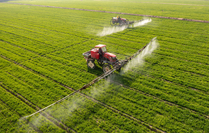 2022年3月9日,在江蘇省海安市大公鎮賁集村,村民駕駛植保機械在小麥田間進行噴灑藥物作業(無人機照片)。新華社發(翟慧勇 攝)