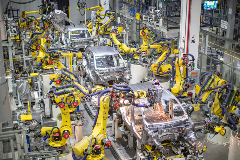 重慶一家新能源汽車企業使用智能化焊接機器人進行焊接作業(2021年4月2日攝)。新華社記者 黃偉 攝