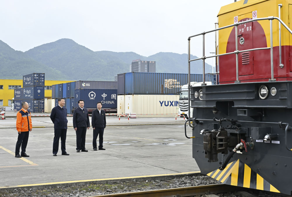 4月22日至24日,中共中央總書記、國家主席、中央軍委主席習近平在重慶考察。這是22日下午,習近平在重慶國際物流樞紐園區重慶鐵路集裝箱中心站考察。新華社記者 岳月偉 攝